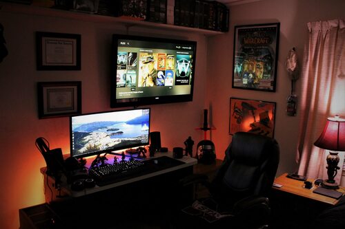 Ниже представлены фотографии различных вариантов организации рабочего места совместно используя компьютер и телевизор на одном столе. Возможно, вы найдете вдохновение для организации своего рабочего уголка!