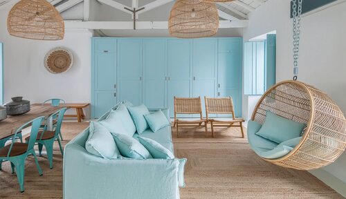 Голубой цвет в интерьере всегда ассоциируется с нежностью и спокойствием. Комбинация голубого оттенка с элементами дерева придает помещению особый шарм и уют.