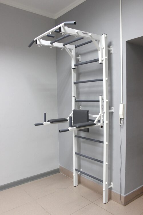 Шведская стенка с турником и брусьями из нержавеющей стали также занимает минимум места в помещении, что делает ее идеальным выбором для домашних тренировок.