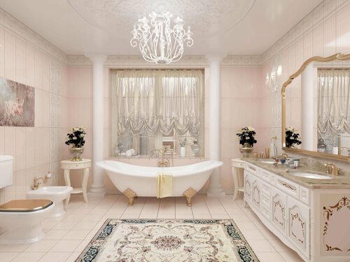 Классический стиль в ванной комнате часто характеризуется использованием натуральных материалов, изящных деталей, резных элементов и изысканных фурнитурных решений. Ванная комната в классическом стиле может быть украшена мрамором, хрусталем, золотом и серебром, создавая атмосферу роскоши и изыска.