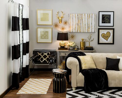 Для гостиной можно использовать черные мебельные элементы, дополненные золотыми аксессуарами и декоративными элементами. Золотые рамы для фотографий, зеркала с золотой отделкой, подушки с золотым узором – все это поможет создать элегантный и изысканный интерьер.