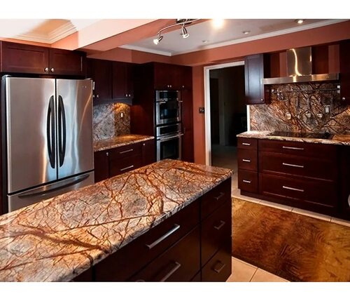 Фотографии ниже демонстрируют различные варианты использования коричневой столешницы под мрамор в интерьере кухни, а также ванной комнаты и других помещениях.