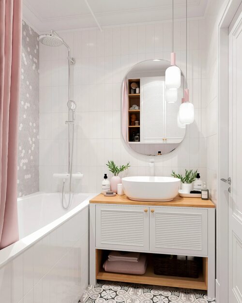 Для создания нежного дизайна ванной комнаты рекомендуется использовать пастельные оттенки, такие как светло-розовый, голубой, лаванда, персиковый и мятный. Эти цвета придают интерьеру легкость и воздушность.