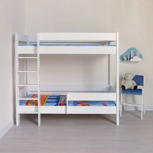 Двухъярусная кровать для детей - это отличное решение для многодетных семей или просто для создания уютного пространства в детской комнате. Белая деревянная отделка придает кровати легкость и свежий вид, что делает ее идеальным выбором для любого интерьера.