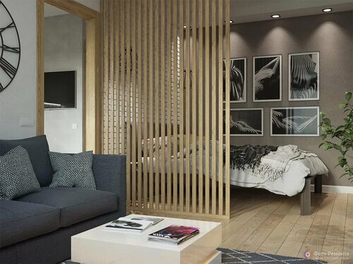 Спальня с гостинной с деревянной перегородкой