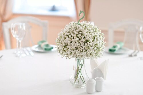 Гипсофила может быть использована в качестве центрального элемента на столах гостей. Она прекрасно сочетается с другими цветами и материалами, что позволяет создавать разнообразные композиции.