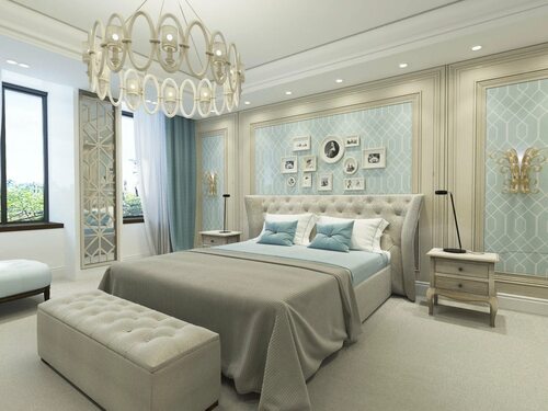 Бежевые спальни в голубом интерьере представляют собой уютное и спокойное пространство, где можно отдохнуть и расслабиться. Этот дизайн сочетает в себе теплоту бежевых оттенков с прохладой голубого, создавая атмосферу уюта и спокойствия.