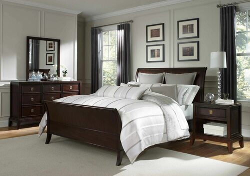 Ниже представлены фотографии, иллюстрирующие различные способы сочетания серых обоев и коричневой мебели в интерьере.