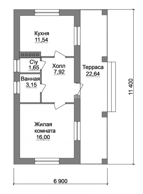 Одноэтажный дом с двумя спальнями и кухней-гостиной и котельной
