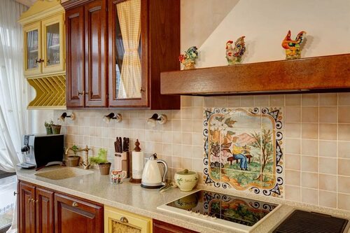 В статье представлены разнообразные варианты плитки для кухни в русском стиле. Вы найдете фотографии интерьеров с использованием различных видов плитки, от классических росписей до натуральных текстур.