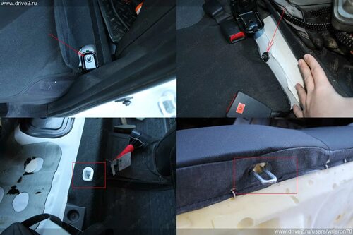 Поднимите передние сиденья, чтобы обеспечить легкий доступ к заднему дивану. Откиньте спинку задних сидений вперед, чтобы получить доступ к креплениям заднего дивана.