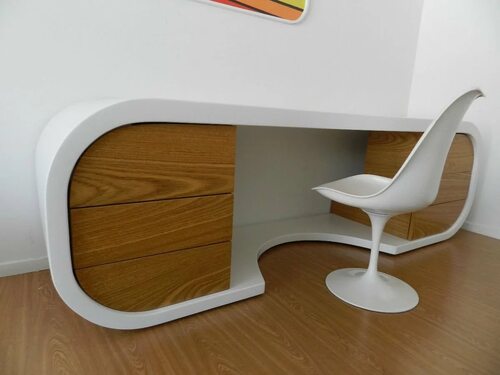 Белый цвет стола придает помещению светлоту и простор, а закругленные формы создают комфортное рабочее пространство. Стол оснащен специальными отделениями для компьютерной техники, что делает его идеальным выбором для работы с компьютером.
