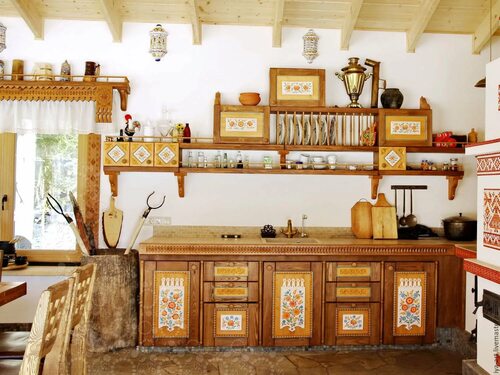 Кухня в русском стиле обычно характеризуется использованием натуральных материалов, таких как дерево, камень, и текстиль. Также важными элементами являются народные узоры, резные детали, и традиционные формы мебели.