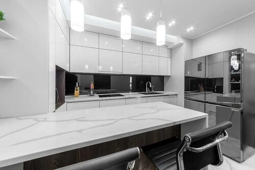 Хай тек в интерьере кухни часто включает в себя использование современных материалов, таких как нержавеющая сталь, стекло, пластик и искусственные материалы. Эти материалы создают чистые линии и гладкие поверхности, придавая кухне современный и стильный вид.