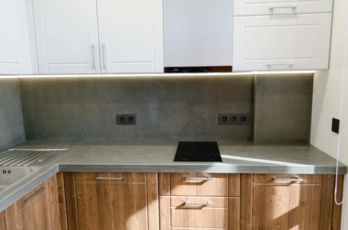 Бетонные столешницы и фартуки могут быть выполнены в различных стилях и оттенках. Они отлично сочетаются как с современным минималистическим дизайном, так и с более традиционными интерьерами. Бетонные поверхности также позволяют экспериментировать с текстурой и отделкой, что делает их универсальным выбором для различных кухонных интерьеров.