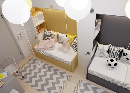 Интерьер узкой детской комнаты для двоих разнополых детей