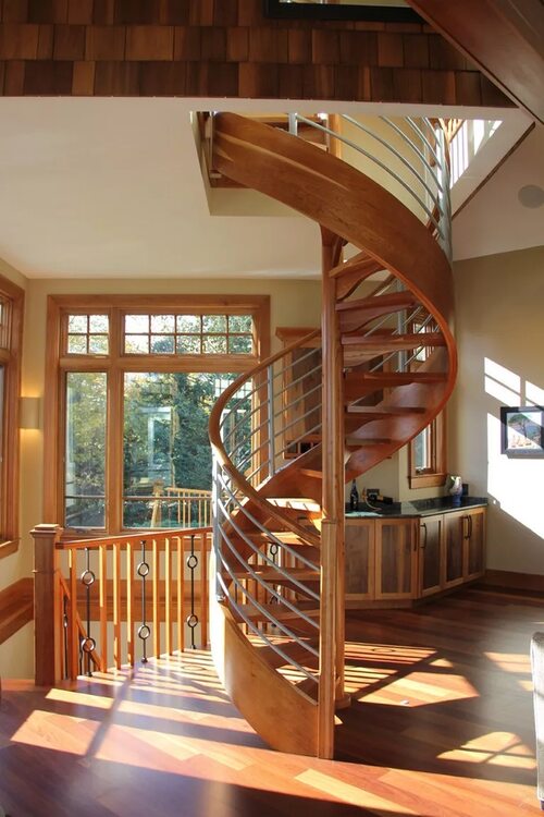 Винтовая лестница отлично вписывается в интерьер загородного дома, создавая эффектное визуальное впечатление. Она может быть выполнена из различных материалов - дерева, металла, стекла, что позволяет подобрать вариант, соответствующий стилю и общей концепции дома. Благодаря своей конструкции, винтовая лестница занимает минимум места, что особенно важно для загородного дома, где каждый квадратный метр ценен.