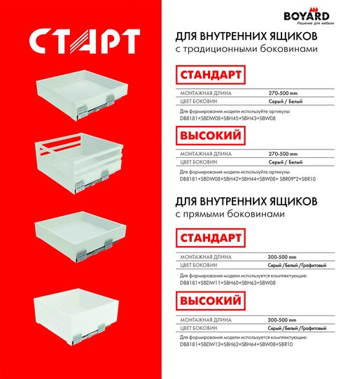 Боярд мебельная фурнитура старт представляет собой высококачественные комплектующие для мебельного производства. Это надежные и эстетичные элементы, которые используются для изготовления мебели различных стилей и направлений.