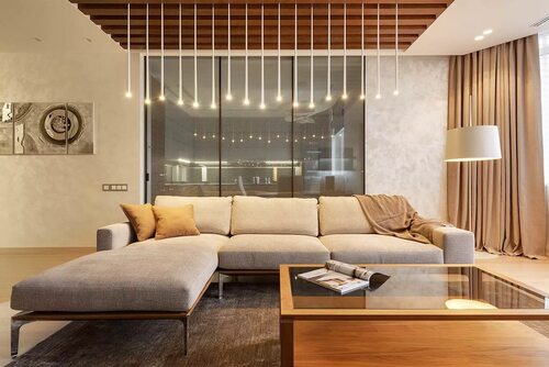 Сочетание естественного света и мягкого освещения создаст атмосферу комфорта в гостиной в стиле теплый минимализм.