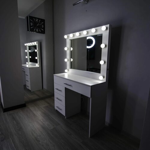 Гримерный столик с подсветкой обычно оснащен яркими лампами, которые обеспечивают равномерное освещение лица и волос. Это позволяет визажистам и стилистам видеть цвета и оттенки более точно, что особенно важно при работе с клиентами на фотосъемках, показах моды и других мероприятиях.