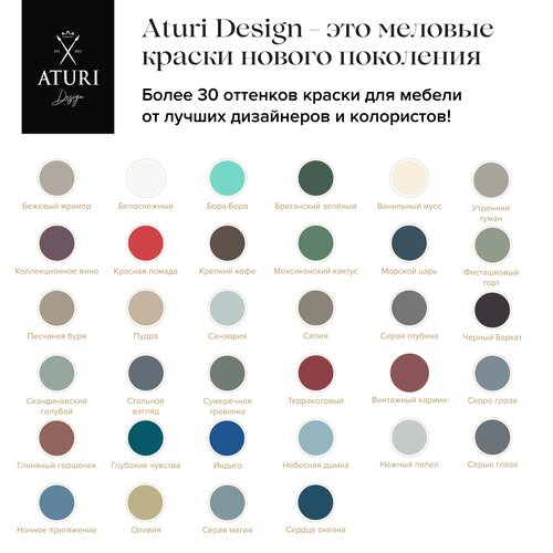 Aturi предлагает широкий спектр цветов для мебельных красок, включая классические оттенки, яркие и насыщенные цвета, а также нюдовые и пастельные оттенки. Вы сможете подобрать идеальную палитру для любого интерьерного решения, от классического до современного стиля.